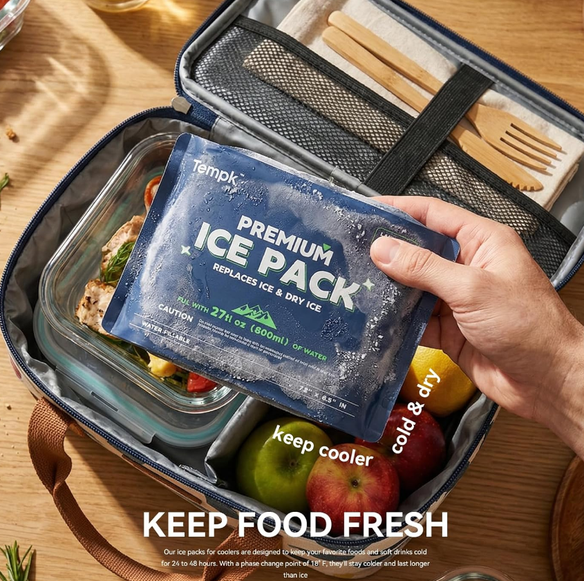 4、Uso al aire libre: Estos ladrillos de hielo son excelentes para mantener los alimentos y las bebidas fríos cuando se usan en bolsas de almuerzo o bolsas más frías durante actividades al aire libre, como caminar, cámping, picnics, paseo en barco, y pesca.